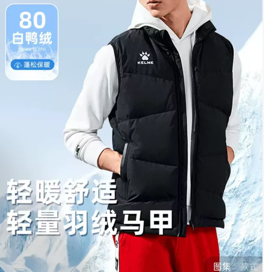 卡尔美/KELME 3891415 足球服装类 羽绒马甲男冬保暖加厚足球训练背心马夹立领运动坎肩白鸭绒
