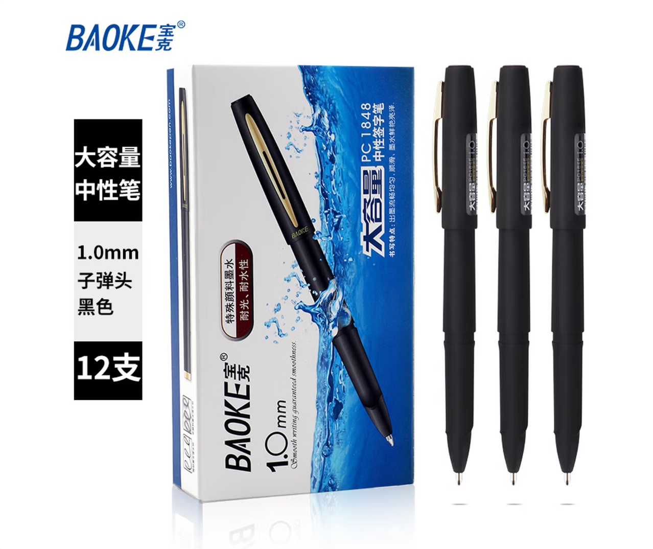 宝克/BAOKE PC1848 书写用笔类用具 1.0mm大容量黑色中性笔品质办公签字笔磨砂笔杆水笔 12支/盒